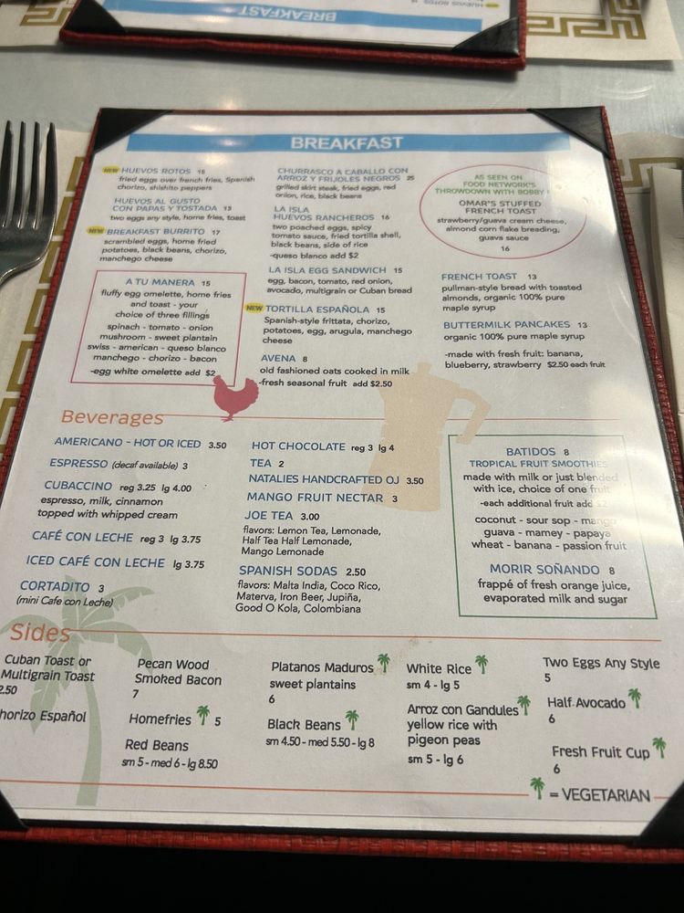 La Isla Restaurant in Hoboken, NJ, offers a diverse menu with options for vegans and vegetarians. The breakfast selection includes Huevos Rancheros, Churrasco a Caballo, and unique dishes like Omar's Stuffed French Toast. Customers praise the flavorful food, friendly staff, and reasonable prices. The Cuban-inspired cuisine, featured on Food Network, has a tropical atmosphere that adds to the dining experience. Must-try items include the Churrasco Sandwich and the Camarones al Ajillo. The cafeteria-style setup allows for a relaxed dining experience, whether for a quick lunch or a date night. La Isla Restaurant stands out for its authentic Cuban dishes, excellent service, and vibrant ambiance.